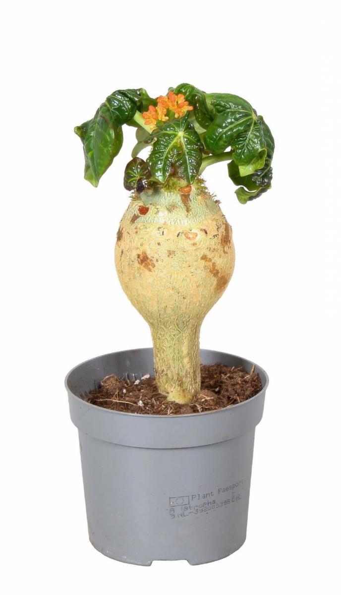 znana tudi kot stekleničasta jatrofa ali buddhova trebušasta rastlina, je zanimiva in edinstvena tropska rastlina, ki navdušuje s svojim nenavadnim, odebeljenim steblom. Njeno deblo, ki spominja na majhno steklenico, služi kot zaloga vode, zato je rastlina izjemno odporna na sušo. Iz središča stebla izraščajo veliki, dlanasto deljeni listi, spomladi in poleti pa razvije očarljive rdeče-oranžne cvetove, ki privabljajo metulje.