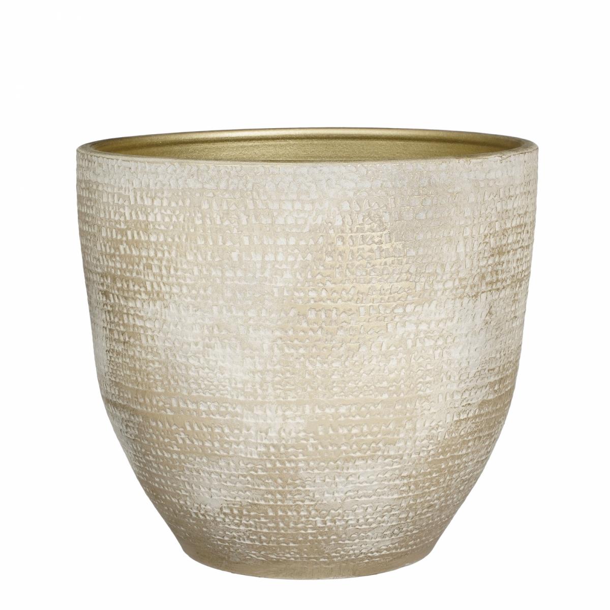 Razkošni okrasni lonec Carrie Champagne Metallic združuje sodobno eleganco in prefinjen kovinski sijaj v odtenku šampanjca. Njegov sijoč videz z nežnim kovinskim efektom ustvarja prestižen vtis in se popolno poda tako modernim kot klasičnim interierjem. Zaradi svoje večje velikosti je idealen za bujnejše sobne rastline, palme ali dekorativne grmičke, ki potrebujejo stabilen in estetsko dovršen lonec.Lastnosti: