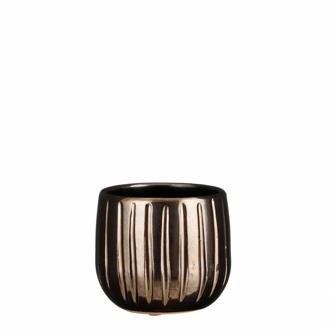 Prefinjen okrasni lonec Pablo Bronze Ribble navdušuje s svojo elegantno rebrasto strukturo in toplim bronastim odtenkom, ki prostoru doda občutek razkošja. Sijoča kovinska glazura poudari detajle teksture in ustvari prestižen videz, ki se odlično ujema z zelenimi rastlinami in sodobnimi interierji. Zaradi kompaktne velikosti je popolna izbira za manjše sobne rastline, kaktuse ali sukulente.Lastnosti: