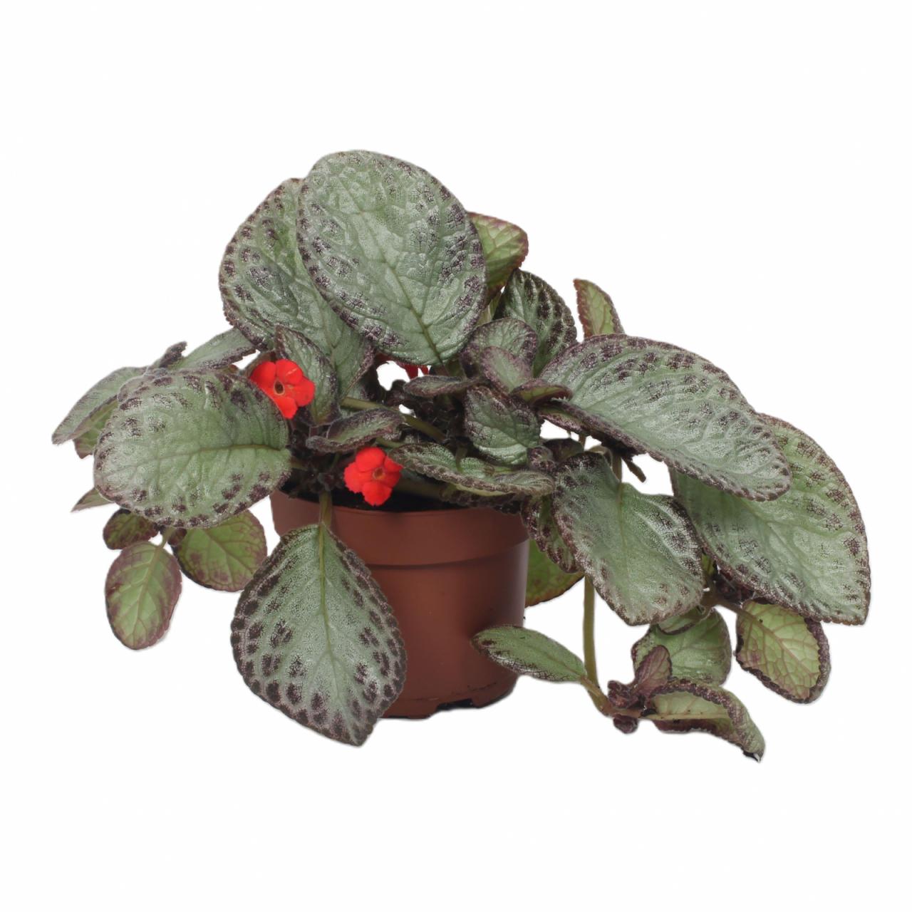 Nežna in očarljiva Episcia 'Joy's Sweety Pink' je tropska rastlina, znana po svojih žametnih listih in drobnih, a živahno obarvanih rožnatih cvetovih. Njeni listi so mehki, svetleči in rahlo valoviti po robovih, s kombinacijo zelenih in srebrnih tonov, ki lepo dopolnjujejo pastelne cvetove. Zaradi svoje kompaktne in rahlo povešene rasti je idealna izbira za viseče lonce ali dekoracijo svetlih notranjih prostorov.Nega: