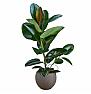 znan tudi kot kavčukov grm ali gumi ficus, je priljubljena sobna rastlina zaradi svojih robustnih listov in enostavne nege. Ime "elastica" izhaja iz dejstva, da rastlina vsebuje mlečni sok, ki se uporablja za izdelavo gume. V preteklosti so iz soka te rastline pridobivali gumo, preden je bila ta industrija nadomeščena z naravno gumo iz gumi drevesa (Hevea brasiliensis). Izvira iz tropskih območij Indije, Indonezije in Malajskega arhipelaga. V naravi lahko zraste v mogočno drevo z višino do 30 metrov.