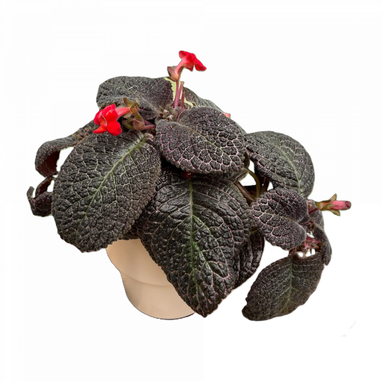 je osupljiva tropska rastlina, znana po svojih žametnih listih z izrazitim vzorcem in živordečih cvetovih, ki poživijo vsak prostor. Listi so temno zeleni z bakreno rjavimi odtenki in rahlo dvignjeno teksturo, ki spominja na krokodiljo kožo – od tod tudi njeno ime. Zaradi svoje kompaktne in razvejane rasti je popolna izbira za viseče lonce, terarije ali kot okrasno rastlino na polici.