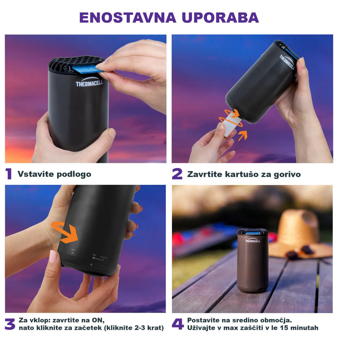 Thermacell Halo Mini je učinkovita naprava za odganjanje komarjev, ki zagotavlja zaščito na prostem brez uporabe neprijetnih kemičnih pršil ali losjonov. Naprava deluje z uporabo gorivnih kartuš in repelentnih podlog, ki ustvarjajo nevidno zaščitno območje, ki odganja komarje.