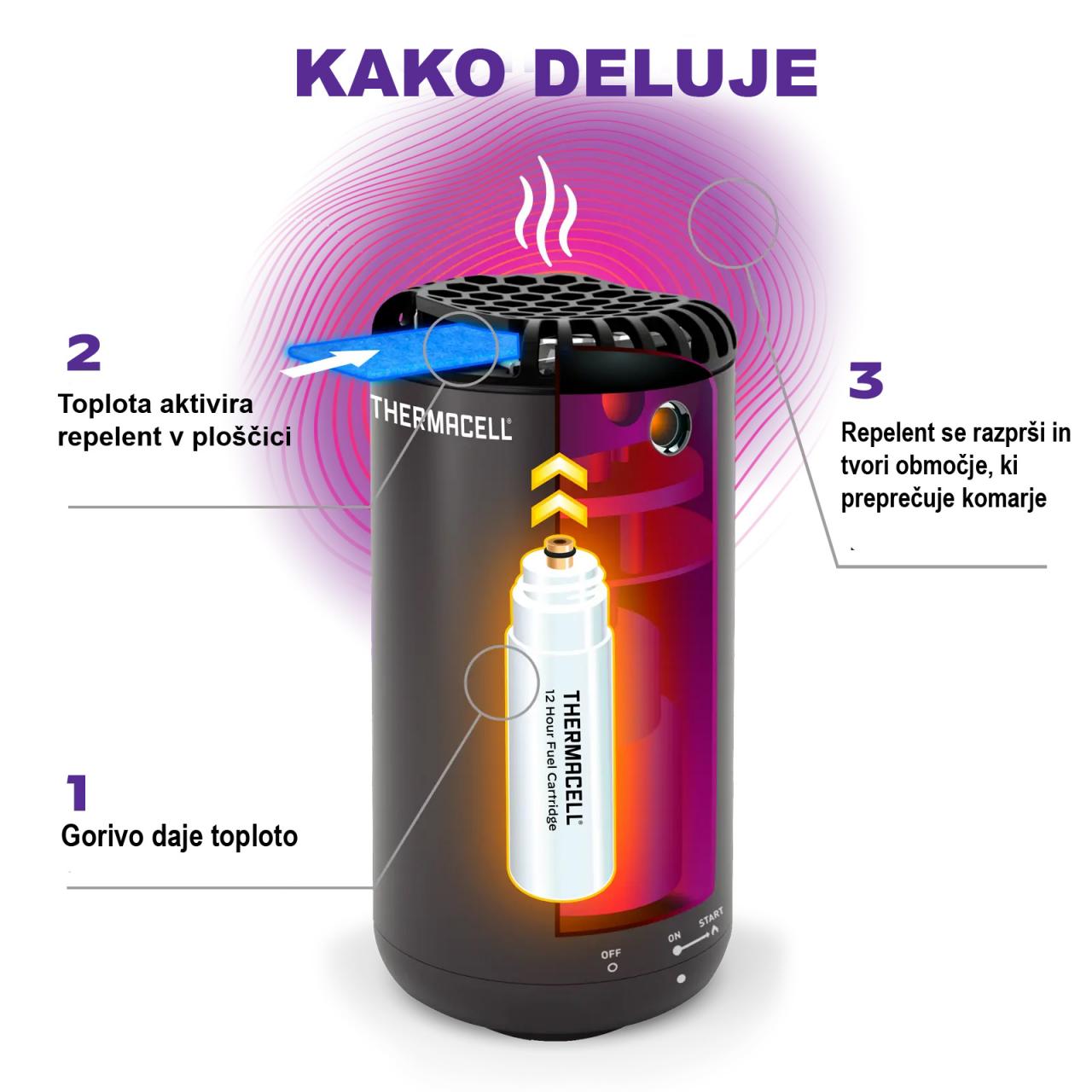 Thermacell Halo Mini uporablja majhno gorivno kartušo, ki segreva kovinsko ploščo. Na ploščo se namesti repelentna podloga, ki vsebuje sintetični aletrin, spojino, navdahnjeno z naravnimi repelenti, najdenimi v rastlinah. Ko se podloga segreva, sprošča repelent, ki se razprši v okolico in ustvari zaščitno območje v velikosti približno 21 m² (4,5 metra radija). Ta zaščitna cona preprečuje komarjem, da bi se približali in vas pikali.